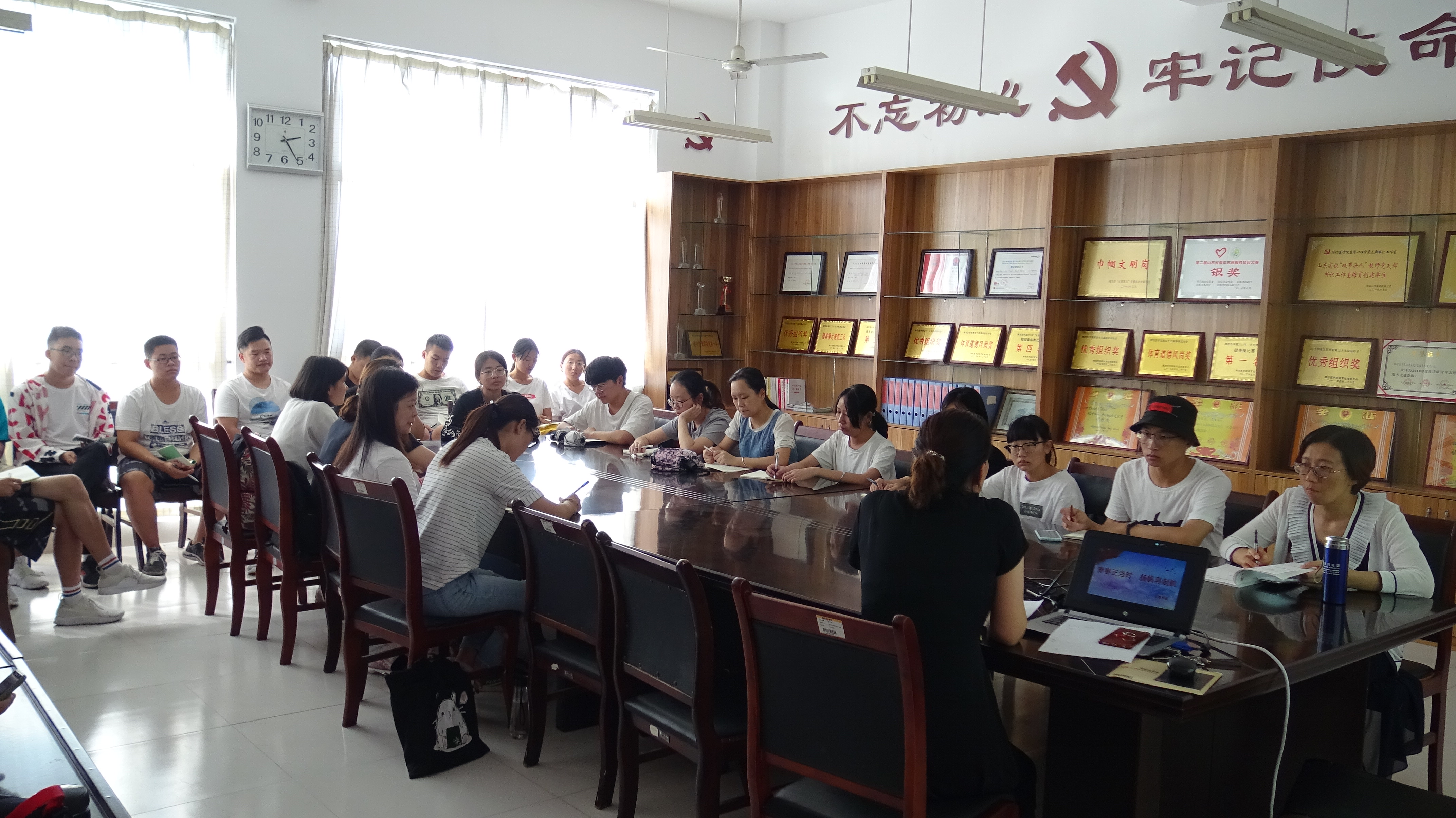 首先,党总支副书记朱红做了“青春正当时 扬帆再起航”专题报告,勉励同学们:青春正当时,要修身立德,勤思笃实,励志奋进,成为又博又专的有为青年。部分学生代表汇报了暑期参与“心灵关爱”志愿服务和寿光灾后心理援助的心得体会,纷纷表示,会刻苦学习,脚踏实地,利用所学服务社会,奉献社会。