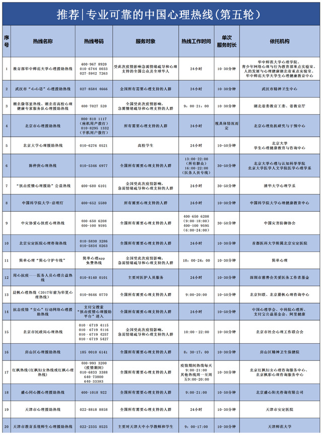 本次中国心理热线服务调查项目由中国心理学会临床心理学注册工作委员会(注册系统)、中国心理学会临床与咨询心理学专业委员会联合发起,湖北东方明见心理健康研究所承办。该项目于2020年2月15日启动,至今已经对425 条心理热线进行了调查。通过对热线工作场所设备、热线咨询员专业资质、服务规范、管理规范五个维度23个评估指标的评价,筛选出了78条评分高热线,我校对外心理援助热线0536-2602333名列其中,并在CPS临床心理注册系统平台对民众进行了公布,作为常态化的年度心理援助热线向社会提供心理援助服务。