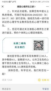 心理学院与中小学广泛开展心理健康测评、宣教及个体干预工作;与养老机构共建“幸福时光”志愿者陪伴项目;与前展学校合作开展自闭症的评估和训练工作;针对智障儿童进行“沙盘治疗”工作;与潍坊市总工会开展心理咨询师培训及EAP援助工作,服务触角遍及民生实际。“盲童心理帮扶”志愿服务活动获山东省第二届青年志愿服务大赛阳光助残类银奖、2017年阿克苏诺贝尔中国大学生社会公益奖铜奖。潍坊医学院心灵关爱志愿服务队之暖星小队获“2018年度潍坊市青年志愿服务先进集体”荣誉称号。