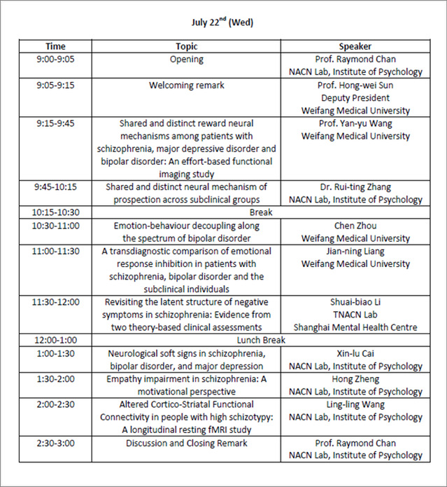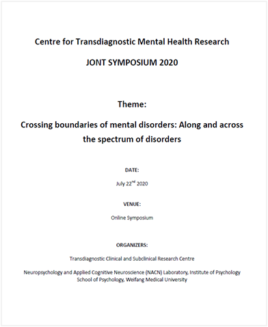 7月22日,中国科学院心理研究所与我校共建跨临床与亚临床群体心理健康研究中心举办首届学术论坛,会议主题为:Crossing boundaries of mental disorders: Along and across the spectrum of disorders。来自中科院心理所神经心理学与应用认知神经科学实验室、上海精神卫生中心以及我校心理学院的教师、硕士博士研究生等参加了本次线上论坛。论坛由我校特聘教授、危机心理干预方向博士生导师、中科院心理研究所陈楚侨研究员及我校副校长孙宏伟教授共同主持,心理学院王艳郁教授等8位研究人员进行了主题汇报。