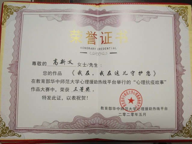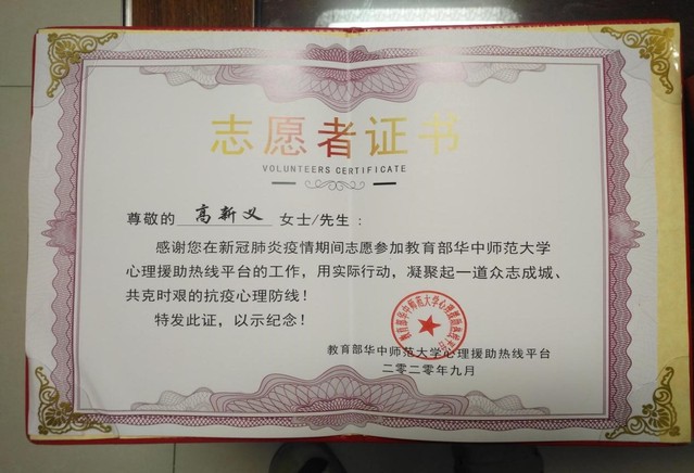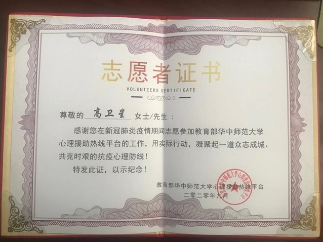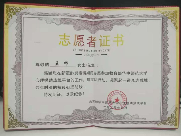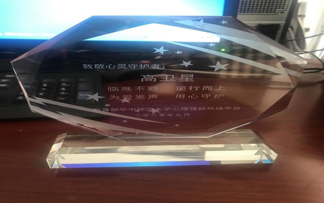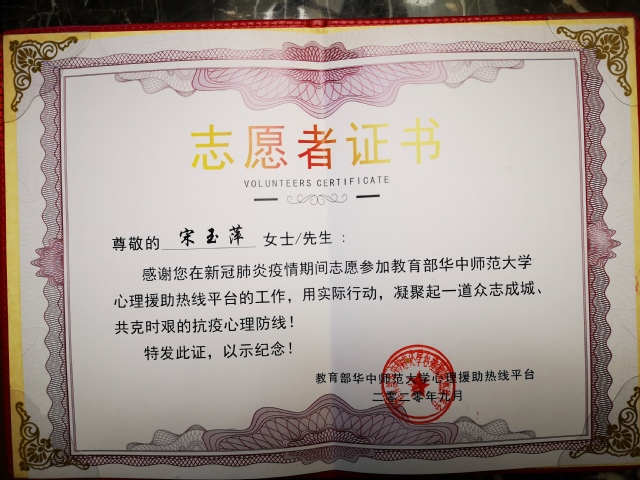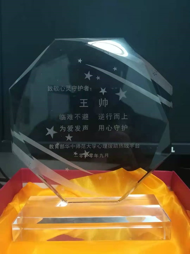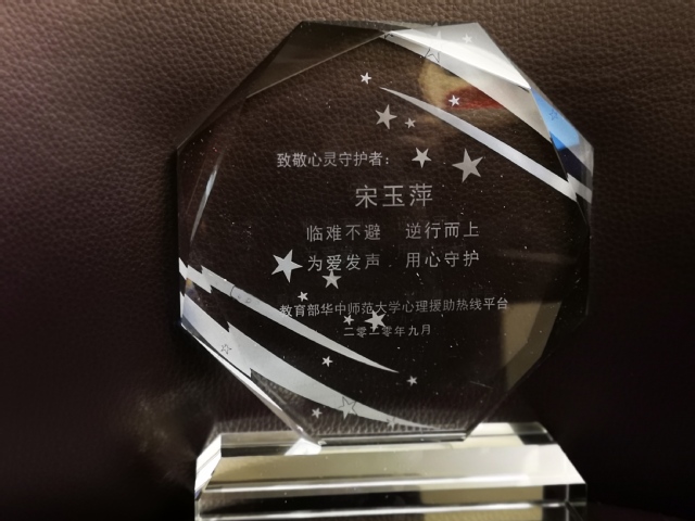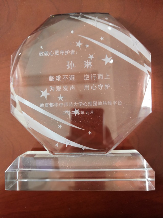 近日,教育部华中师范大学心理援助热线平台颁发了志愿者证书及“临难不避、逆行而上、为爱发声、用心守护”荣誉奖杯。心理学院的宋玉萍教授、孙琳副教授、高新义、高卫星、王帅5位教师均获得此殊荣。